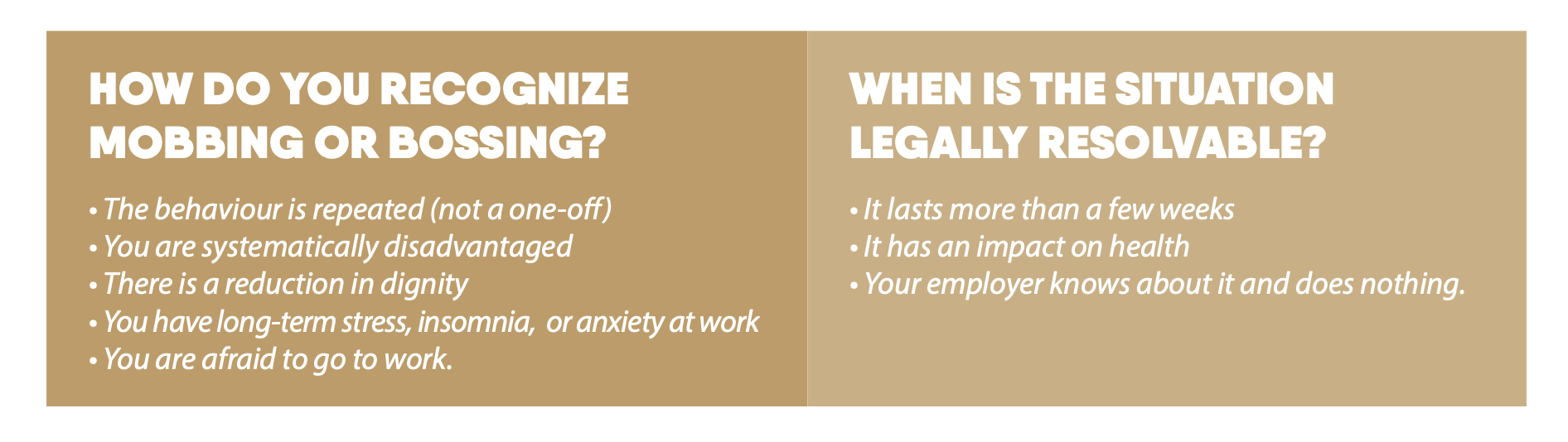 Mobbing is workplace bullying between colleagues. It is therefore systematic and repeated behaviour that is intended to humiliate, intimidate, control, or otherwise harm a colleague who is not in a subordinate position.