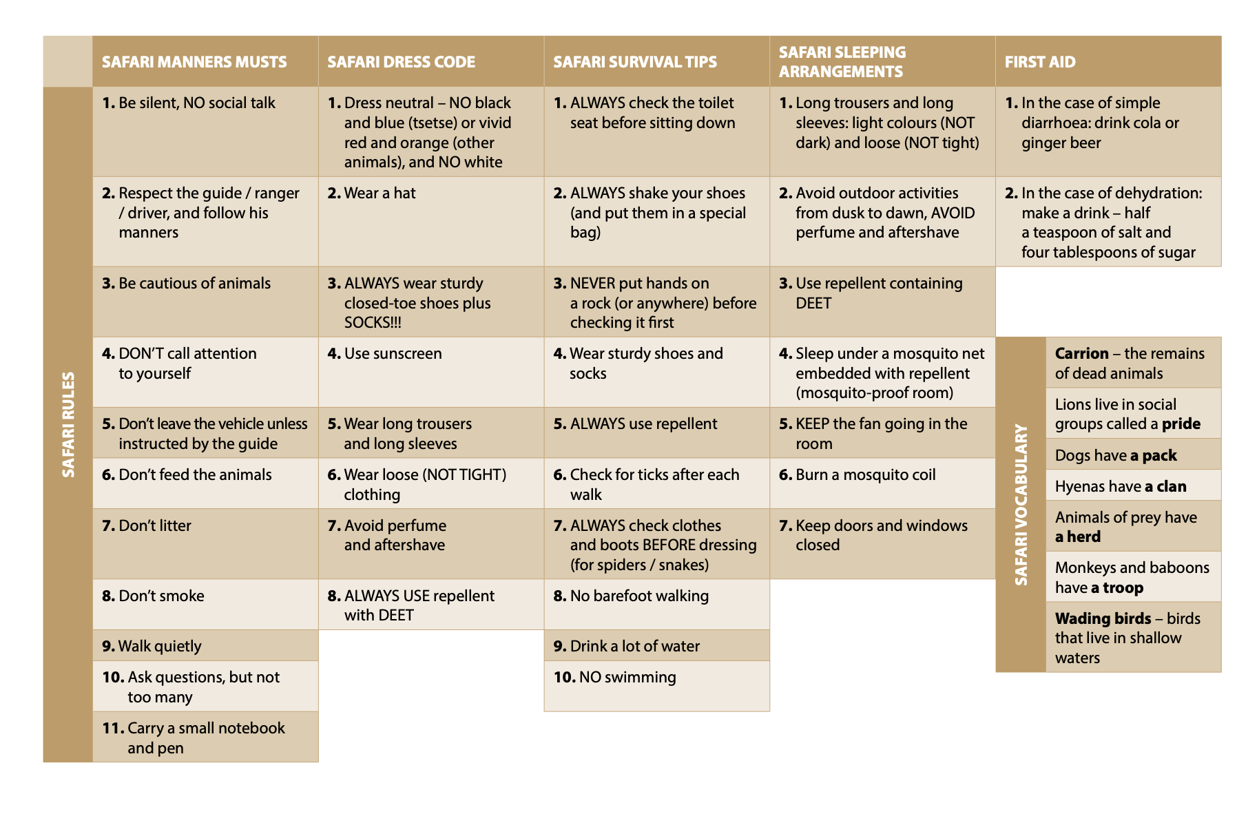 We wanted to go on a safari in Africa, so we spent some time checking which operator offers the best tours. We were especially interested in the size of the group, the level of the hotels, and a full-board option. The most recommended safari colours are yellow, beige, and khaki. We bought new, special clothing for our adventure. Mosquito-borne diseases are a big problem in Africa, so we took some liquid and equipment against them.