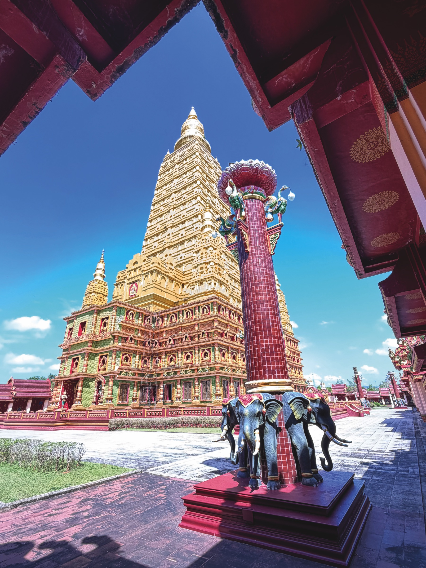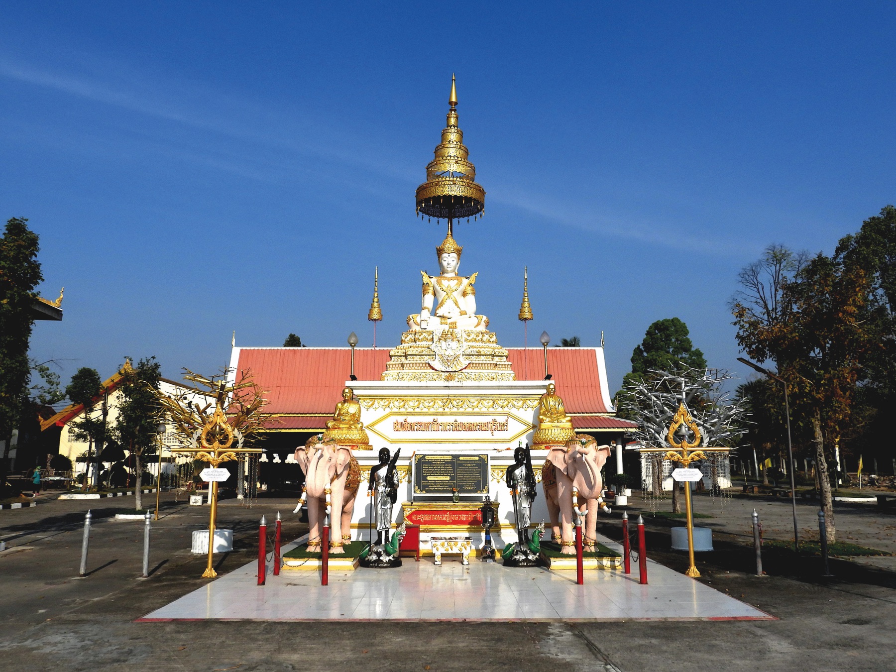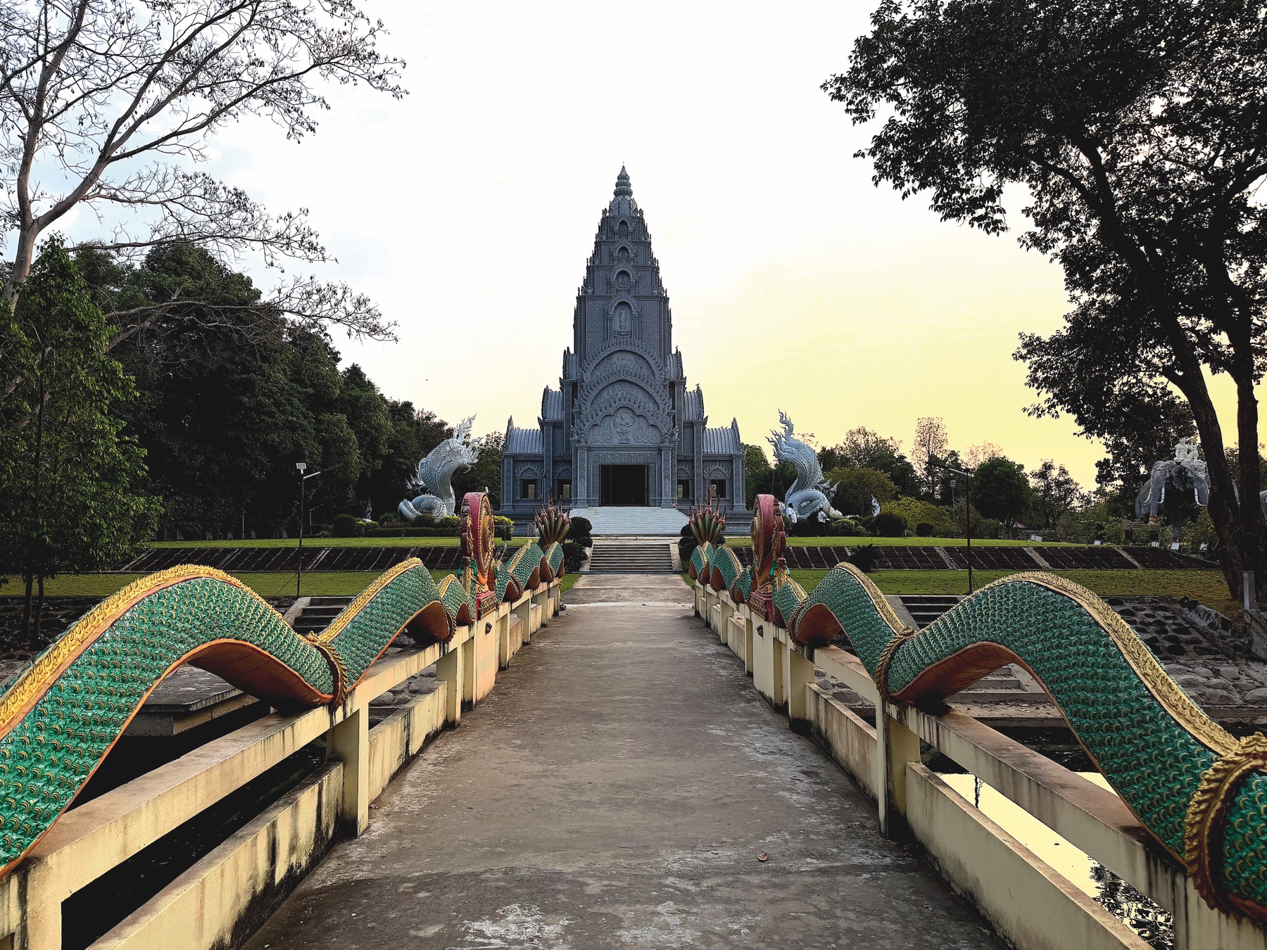 Our last stop on the way to Surin was Wat Mongkolrat (วัดมงคลรัตน์สุรินทร์), a famous temple especially well known among older generations as Wat Tako Luang Pu Phuan. The front of the pagoda features elephant statues and a naga (serpent) bridge leading up to it. Its grounds, surrounded by a pond and beautifully landscaped with trees, create a serene, forest like atmosphere.