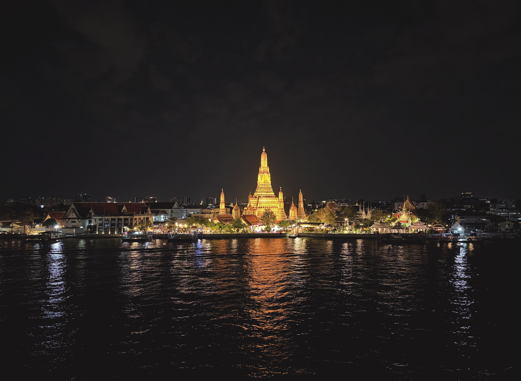 The boat was medium sized, with about fifteen tables. Each couple or group had their own private table, beautifully set in the manner of a fine dining restaurant. The boat moved slowly; even though it was a bit windy, we hardly felt it. Bangkok is a beautiful city, and during the cruise we could admire all the illuminated monuments along the river.