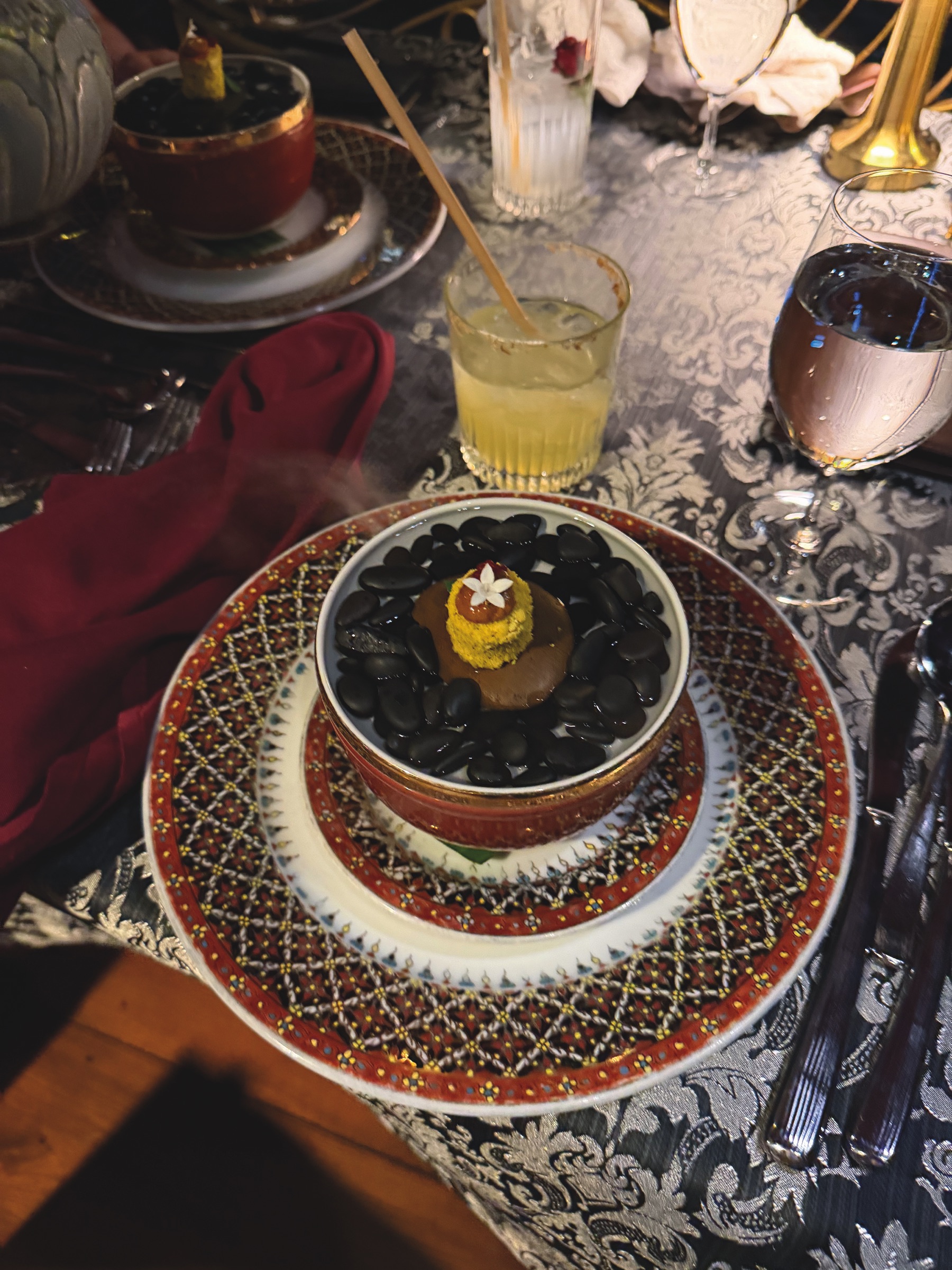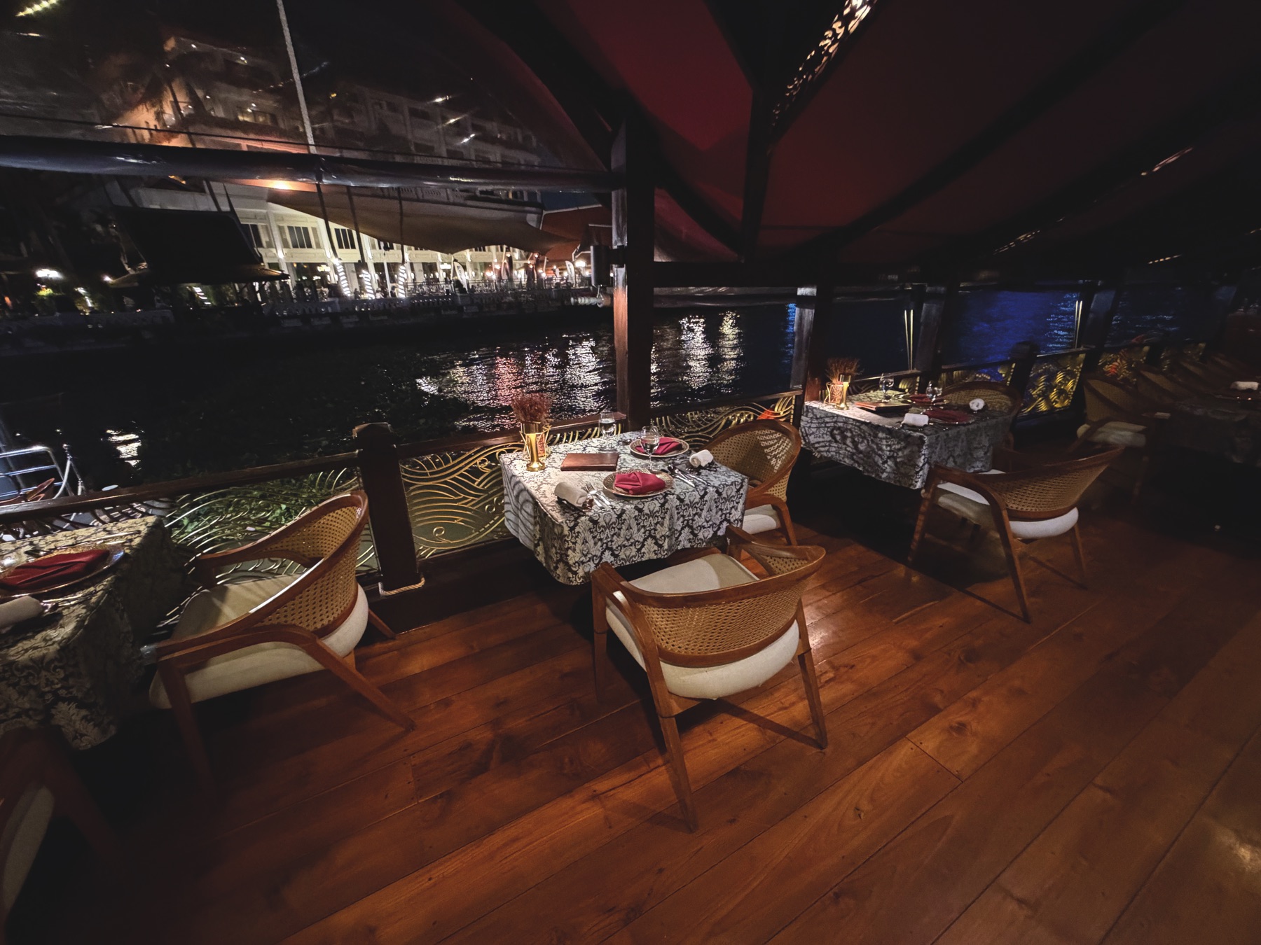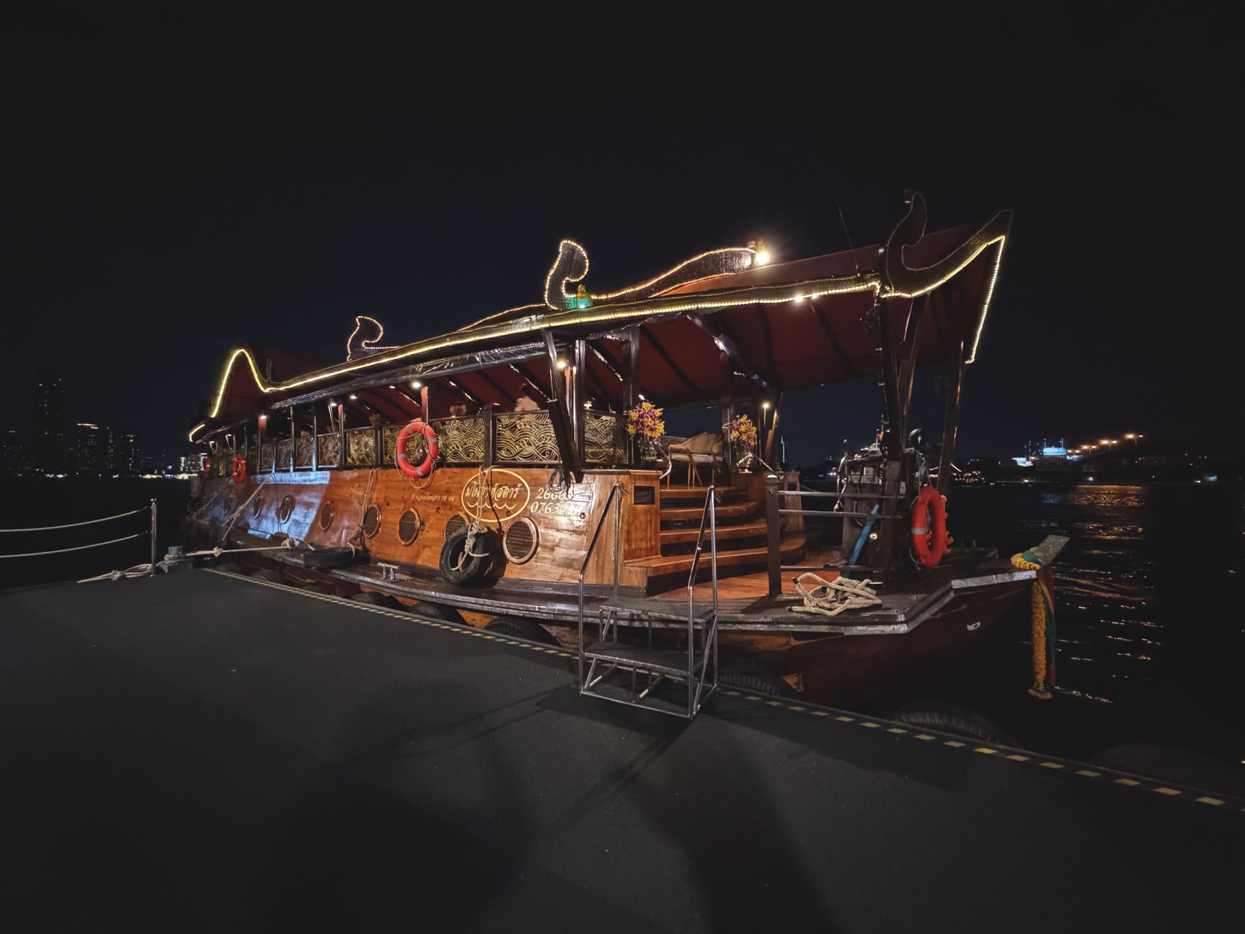 We quickly left the hotel and took a Bolt taxi to our night cruise on the Chao Phraya River. After so many visits to Bangkok, we finally decided to try this experience and see the city lights from the water. There are many options, from small boats to large vessels – we chose the Manohra Dinner Cruise. Boarding took place at the Anantara Riverside Bangkok Resort, a luxury hotel on the river. We arrived a few minutes before departure and were welcomed by friendly staff with a welcome drink, in a beautiful riverside setting.