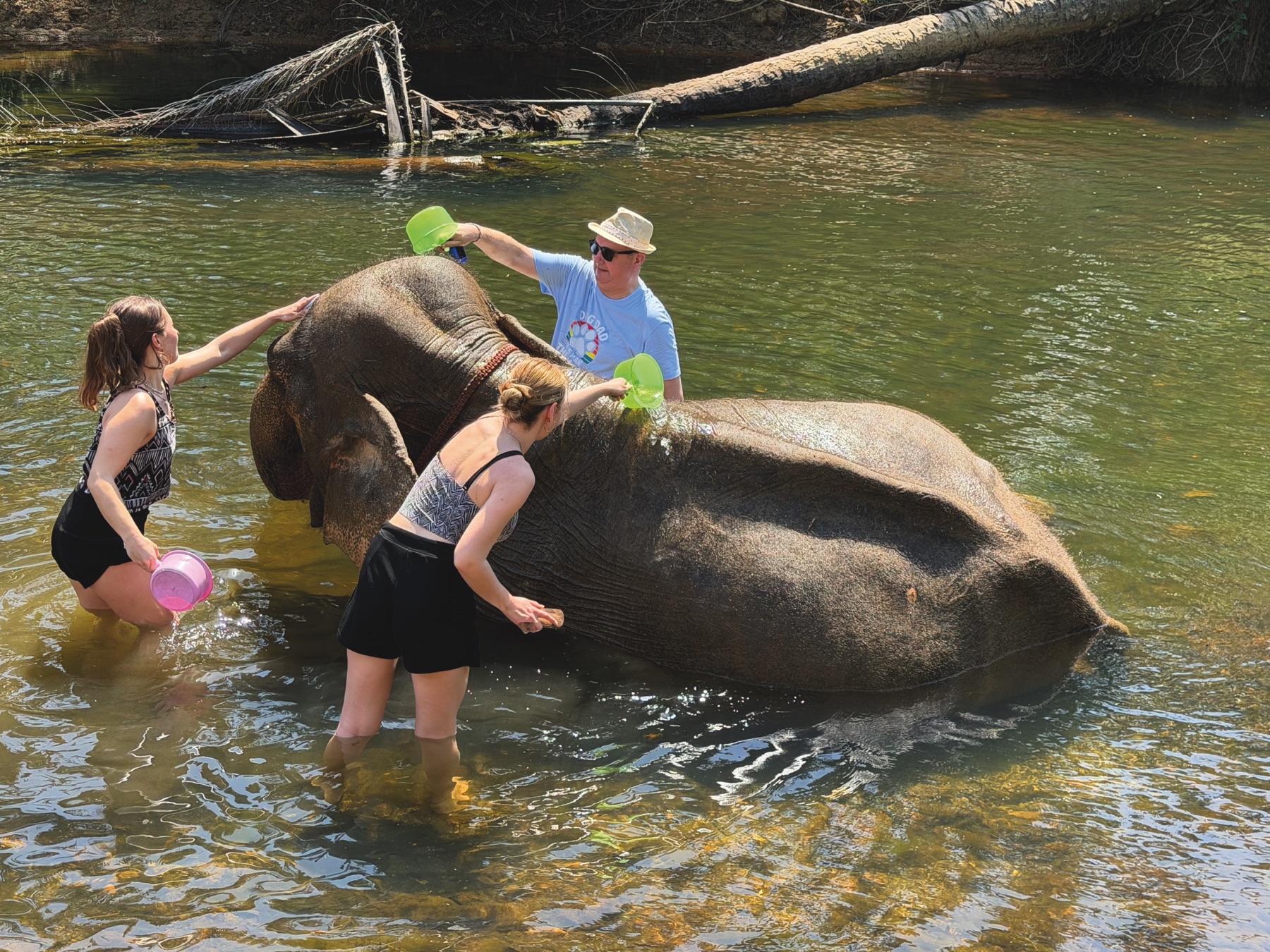 Nearby is a small elephant nature reserve, with a single elephant rescued from hard labour in northern Thailand. We were happy to walk her to the river and bathe with her – fun for her and for us – such a big, gentle animal finally living a better life. Back at the reserve, we prepared special food for her and fed her – a simple joy.