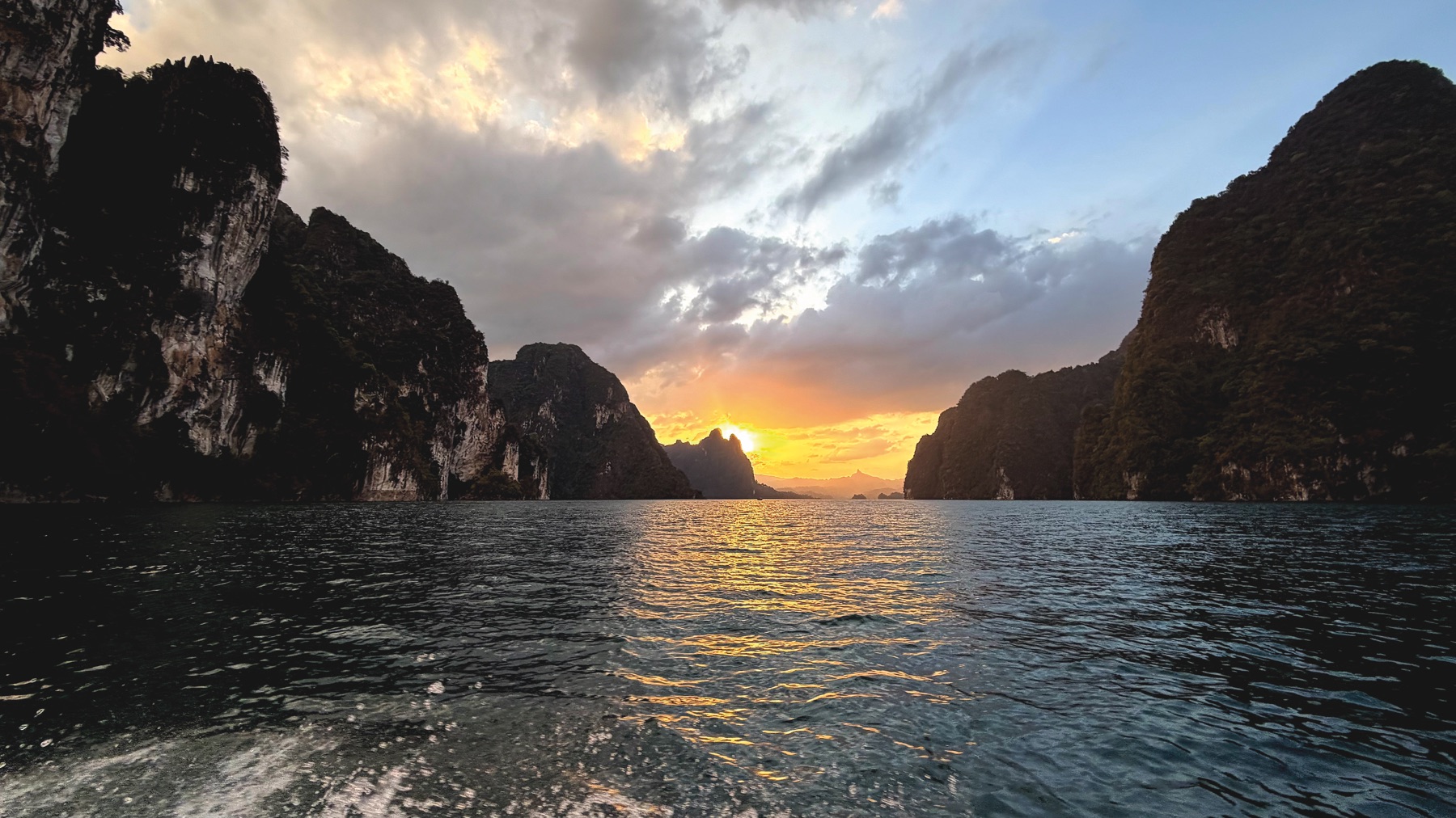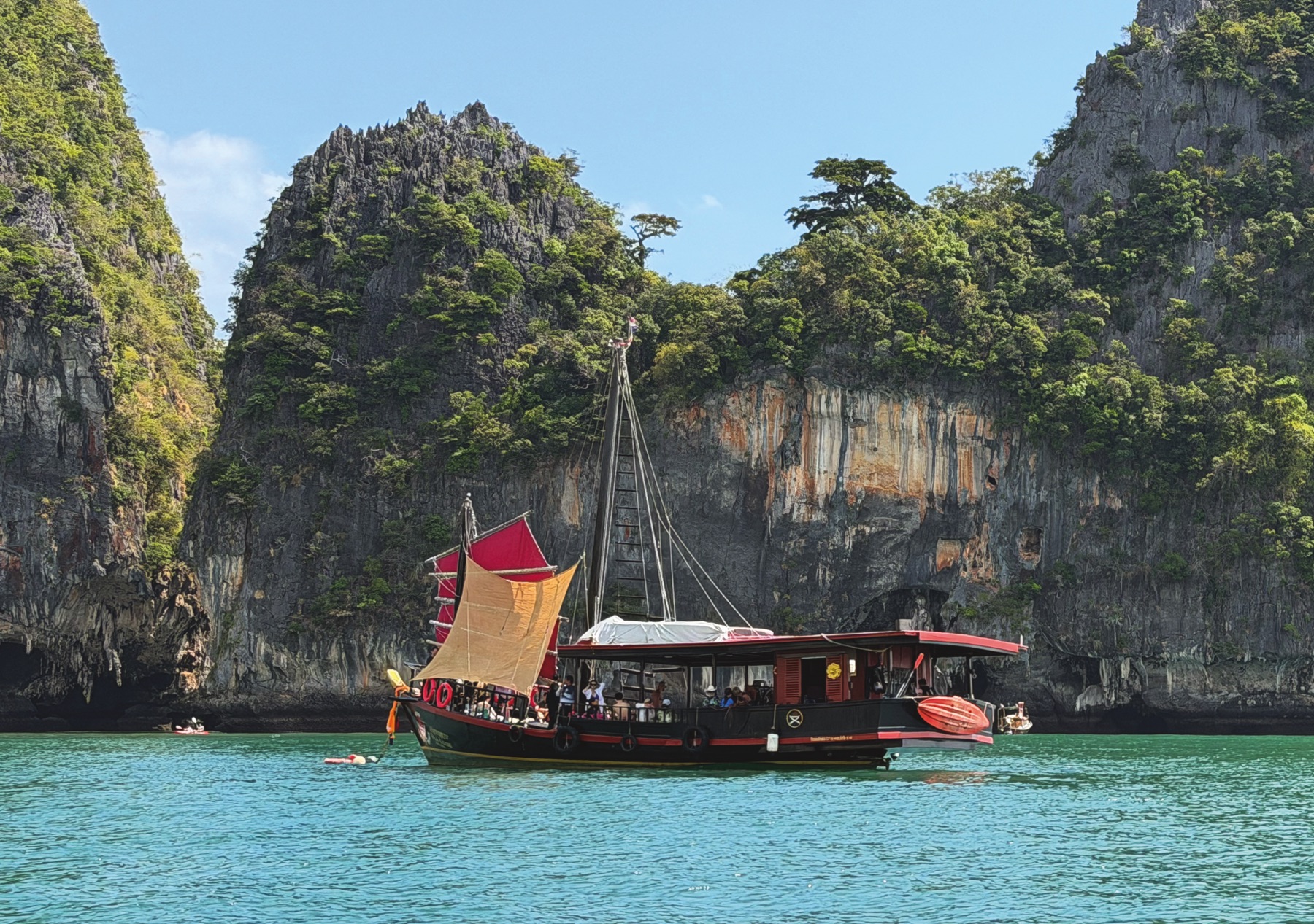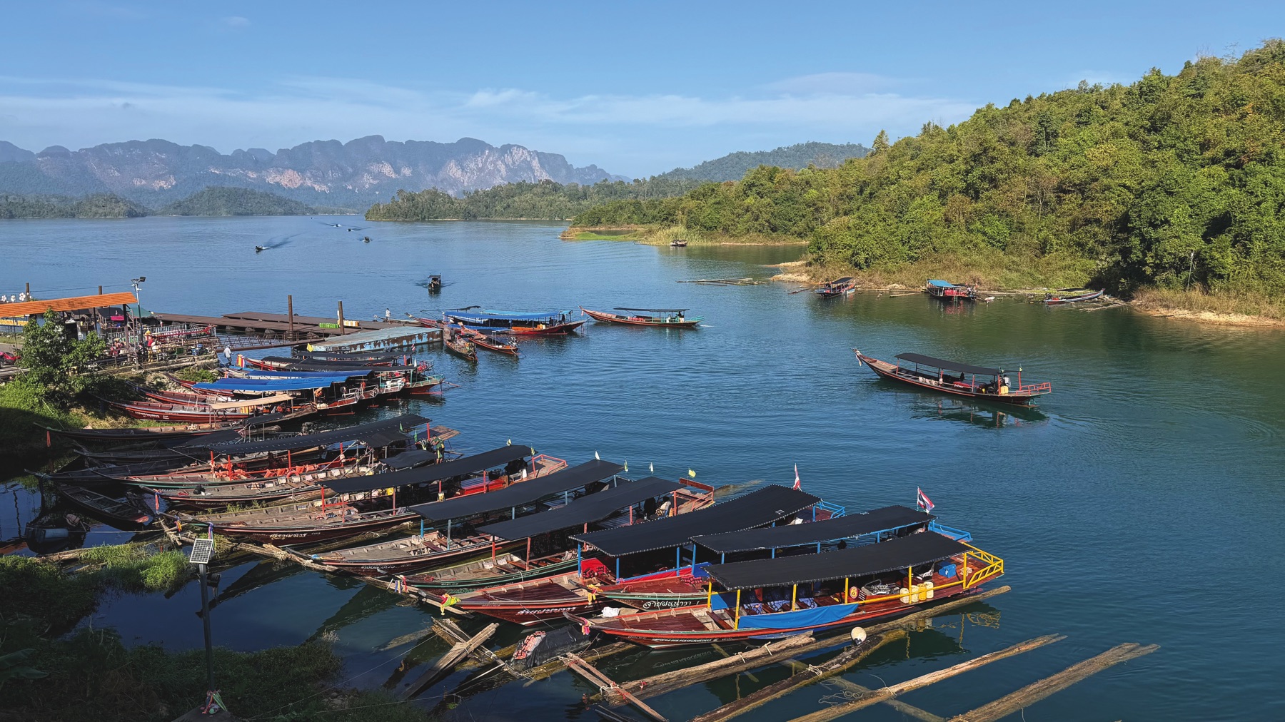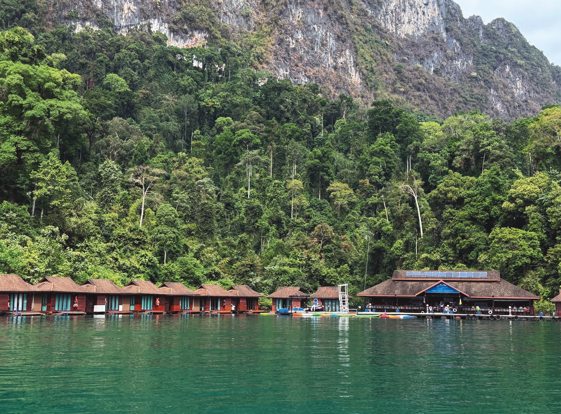 The next morning, we continued to Laguna Chiew Lan at Ratchaprapha Dam Lake (เขื่อนรัชชประภา). The floating hotel reminded me of a resort in the Seychelles, but less luxurious. Wi-Fi was available only at reception, and electricity ran from 6 p.m. to 6 a.m. Still, it was fun and unique to swim directly from our room into the lake. We visited the Coral Cave, and explored the area by longtail boat.