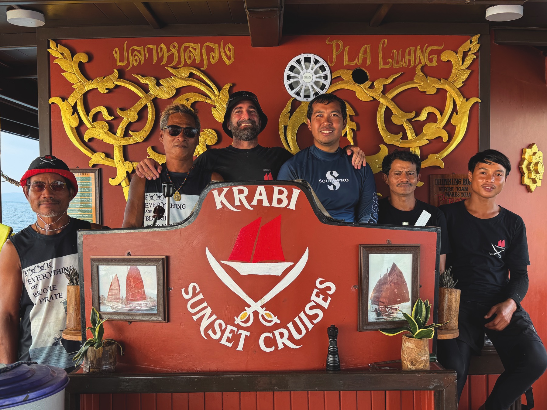The next day, we chose a special sunset cruise: Krabi 4 Islands Sunset, Snorkeling Cruise & Bioluminescent Swim with Krabi Sunset Cruises (www.krabisunsetcruises.com/tour/sunset-cruise). Pick up was at Railay West Pier (about 15 minutes from our hotel) at 1 p.m. A longtail boat took us to the main vessel – a pirate style wooden boat. There were about 20 tourists on board, giving everyone plenty of space to relax in. We were welcomed with tasty drinks and lively music as we slowly cruised toward the islands for swimming and snorkelling. The sunset was magical. As darkness fell, we enjoyed a delicious Thai dinner and a final swim before returning to the hotel.