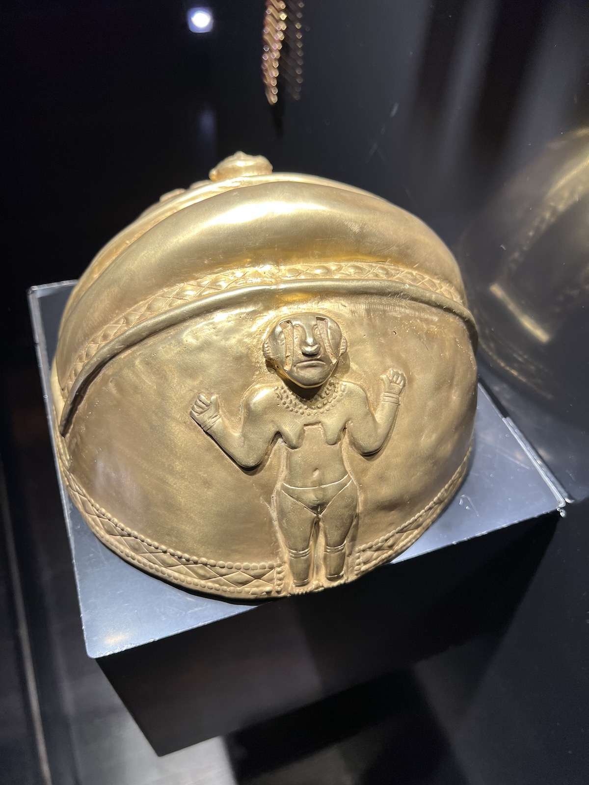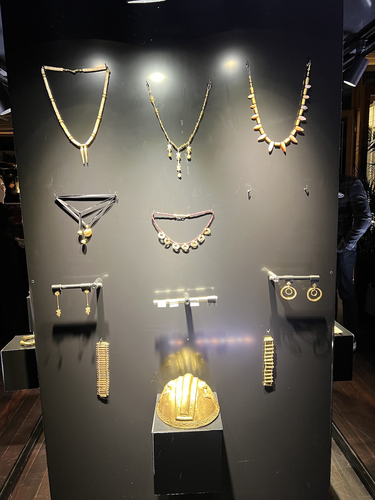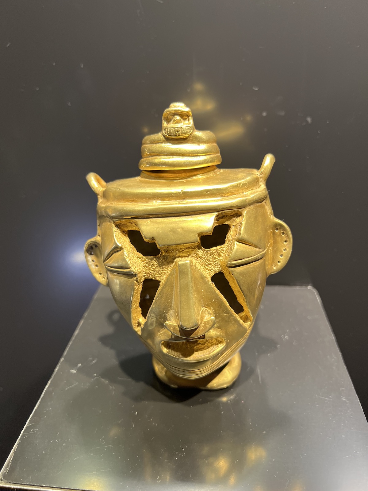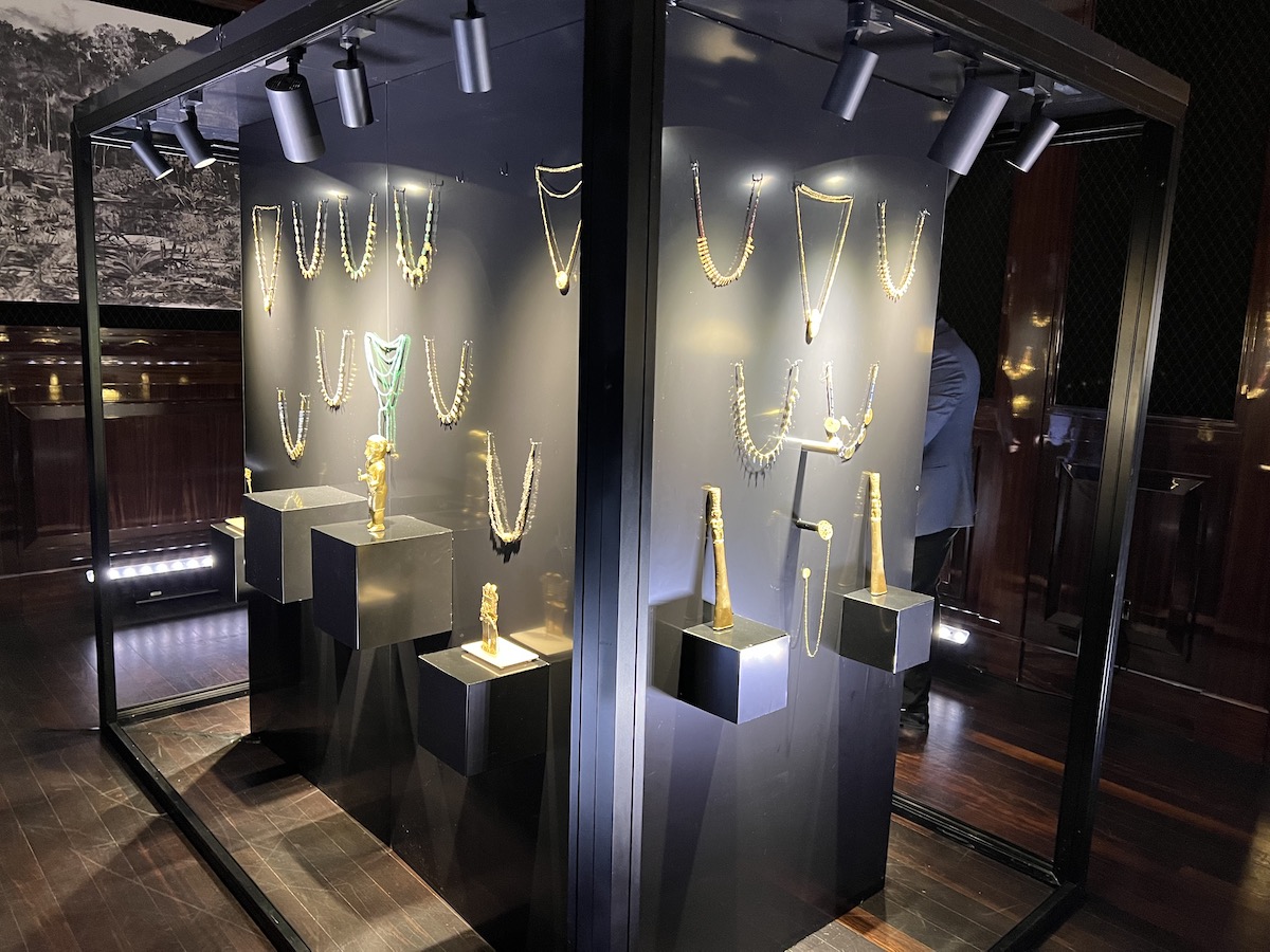 Gold and Coca Leaf is a traveling exhibition that, in nine European countries, proposes a dialogue between heritage,contemporary art,and publicpolicy. At its core are 56 exactreplicas of the Quimbaya Collection, created by master goldsmith Omar Hurtado in dialogue withk knowledge bearers, and La Chagrade Amoka, awork by Tatiana Arocha centeredon the coca leaf as a living archive of the forest and of biocultural memories.