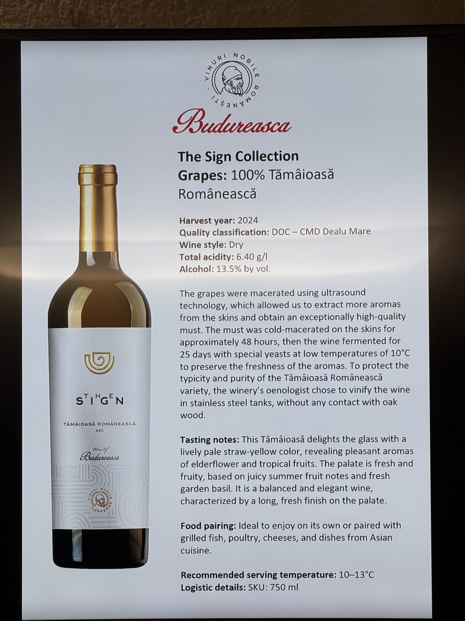 - The Sign Tamaioasa Romaneasca –delights us in the glass with a beautiful straw yellow color, revealing pleasant aromas of tropical fruits and green basil. The taste is fresh and fruity, also based on notes of green garden basil. It is a balanced and elegant wine, characterized by a long and fresh finish on the palate, with delicate mineral accents;